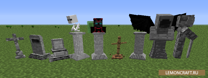 Мод Gravestone - Graves можно причислить к разряду мрачных модов. Он добавляет в игру все что связано с мертвечиной. Кладбища, надгробия, новые мобы, ну и конечно же сокровища, куда же без них. Теперь трупы не будут валяться по всей деревне, а покоится на кладбищах. Если умрет ваш питомец, на месте его смерти появится памятник. Если умрете вы на месте вашей смерти появится надгробие.